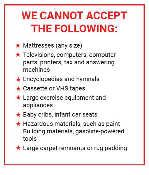 Inappropriate “donations” are expensive for us to have hauled away and thereby reduce what we can do to help people in the community. Please donate appropriately during business hours.