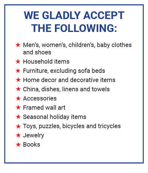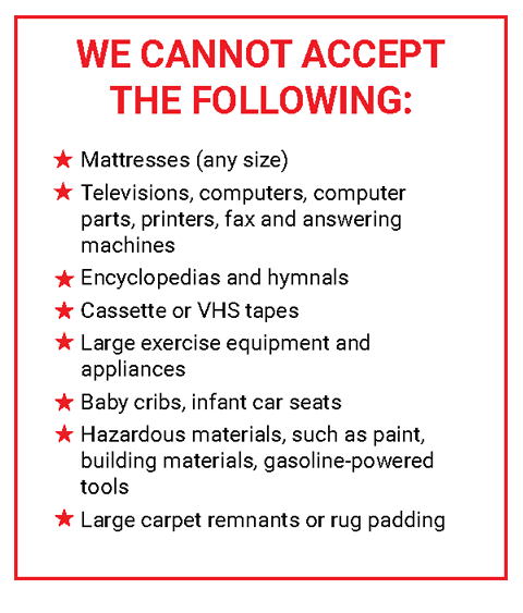 Inappropriate “donations” are expensive for us to have hauled away and thereby reduce what we can do to help people in the community. Please donate appropriately during business hours.